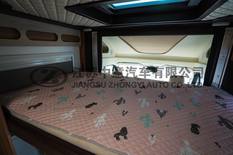 駕駛室上方為一張約130cmx200cm的床,床頭配有電源插座和閱讀燈。尾部上下床的設計,合理利用空間。