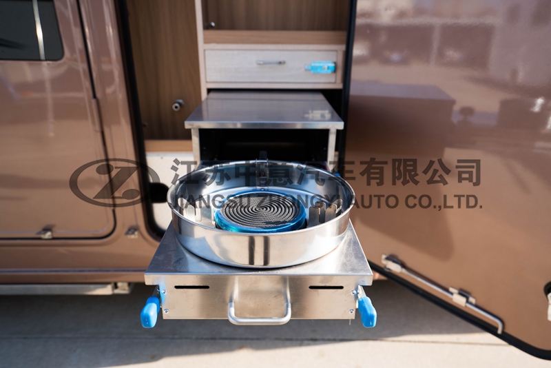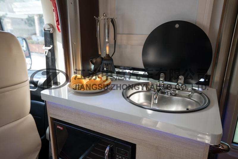 廚房區(qū)域配備了不銹鋼洗菜池和電磁爐,車載冰箱,微波爐等。