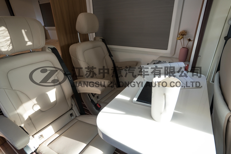 內(nèi)飾設計精致素雅,標配的雙人卡座沙發(fā),配有安全帶,通過配合升降桌的變換,可以形成一張兒童臥床。